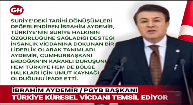 Aydemir, Suriye’de yaşanan tarihi dönüşümleri ve Türkiye’nin bu süreçteki liderlik rolünü değerlendirerek, Türkiye’nin Suriye halkının özgürlüğüne kavuşması için verdiği desteği “insanlık vicdanına dokunan bir liderlik” olarak nitelendirdi. Cumhurbaşkanı Erdoğan’ın kararlı tutumunun, sadece Türkiye için değil, bölge halkları için de umut kaynağı olduğunu belirtti.