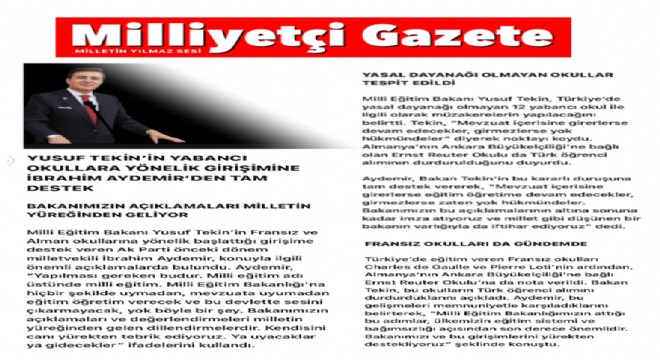 Aydemir, “Yapılması gereken budur. Milli eğitim adı üstünde milli eğitim. Milli Eğitim Bakanlığı’na hiçbir şekilde uymadan, mevzuata uyumadan eğitim öğretim verecek ve bu devlette sesini çıkarmayacak, yok böyle bir şey. Bakanımızın açıklamaları ve değerlendirmeleri milletin yüreğinden gelen dillendirmelerdir. Kendisini canı yürekten tebrik ediyoruz. Ya uyacaklar ya gidecekler” ifadelerini kullandı.