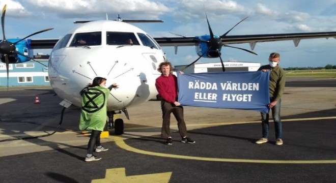 İsveç'in güneyindeki Angeleholm Havalimanı'nda ellerini uçağın burnuna kuvvetli bir yapıştırıcı ile zamklayan iklim aktivisti bir kadın ve arkadaşları uçağın kalkışını engellediler.