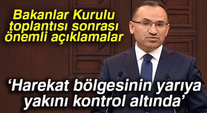 Hükümet Sözcüsü Bekir Bozdağ, “Bugüne kadar harekat alanında 702 kilometrekare alan kontrol altına alınmıştır. Harekatın toplam alanı bin 920 kilometrekare olduğu değerlendirildiğinde, harekat bölgesinin yarıya yakını TSK’nın kontrolü altına geçmiştir” dedi.