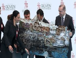 Açılış sırasında Güven Hastanesi Yönetim Kurulu Başkanı Nükhet Küçükel Ezberci, Başkanvekili Banu Küçükel ve Dr. Fikri Küçükel de, Cumhurbaşkanı Erdoğan’a sanatçı Emre Lule’nin yaptığı ahşap üzerine plastik bir Eminönü tablosu hediye etti.