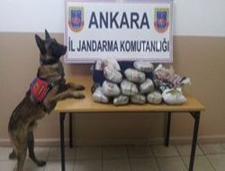 ANKARA / İl Jandarma Komutanlığı ekipleri, Diyarbakır-Yalova seferini gerçekleştiren bir yolcu otobüsünde uyuşturucu madde sevkiyatı yapıldığı ihbarını aldı. Bunun üzerine Ankara-Samsun karayolu Kutludüğün yol ayrımında otobüse operasyon düzenlendi. Narkotik köpeği “Cesur”un katkılarıyla yapılan aramalarda 11 ayrı pakete saklanmış 11 kilogram 135 gram esrar maddesi ele geçirildi. Olayla ilgili esrar maddesinin sahibi olduğu iddia edilen M.U. söz konusu otobüste gözaltına alındı.ANKARA /