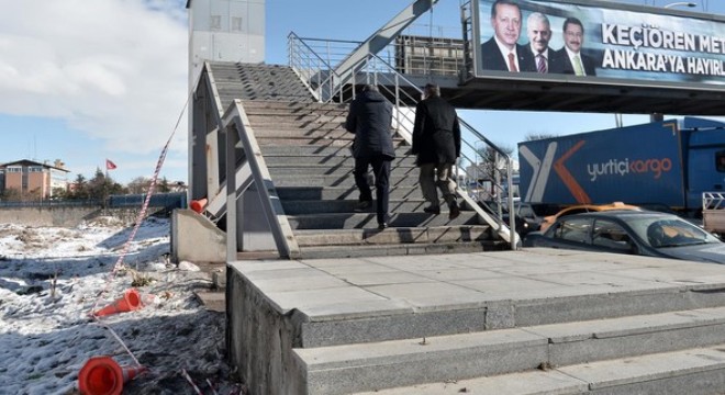 Hürriyet Ankara’nın daha önce iki kez gündeme getirdiği, Turgut Özal Bulvarı üzerinde 1011 Kavşağı’na yakın üst geçit iki aydır onarılmayı bekliyor. Hırsızların hedefi olan yaya üst geçidinin çalınan korkulukları yerine Büyükşehir Belediyesi tarafından kuka konulup, emniyet şeridi çekilmesi dikkat çekti. Önceki gün Başkent’te esen kuvvetli rüzgar üst geçide yerleştirilen güvenlik şeritlerini ve dubaları uçurdu. Korkulukların vakit kaybetmeden yapılmasını isteyen vatandaşlar, “Kar yağışı sonrası yaşanan buzlanmada üst geçit çok tehlikeli oluyor. Kayarak dengesini yitiren birisi olsa o şeritler onu tutamaz aşağı uçar. Nitekim şeritler de uzun süre dayanamamış, birisi düşmeden korkuluklar onarılmalı” diye konuştu.