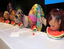 ANKARA / Etkinlikler kapsamında kadınlar arasında karpuz yeme yarışması düzenlendi. Birincilik ödülü çeyrek altın olunca yarışmaya kadınların ilgisi yoğun oldu. 8 kadın sahneye çıkarak bir dilim karpuzu elleriyle tutmadan en çabuk bitirebilmek için kıyasıya yarıştı. Sonrasında düzenlenen erkeklerin yoğurt yeme yarışması da komik görüntülere sahne oldu. 10 erkek de tabağı elleriyle tutmadan yoğurt yemeye çalıştı. Dereceye girenlere çeşitli hediyeler verildi.ANKARA /