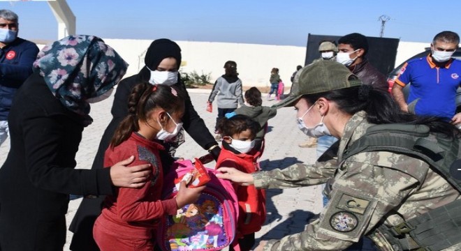 Milli Savunma Bakanlığının paylaşımı; "En zor şartlarda gece gündüz demeden Suriyeli kardeşlerimizin yanında olan kahraman Mehmetçik, Barış Pınarı bölgesindeki öğrencilere okul çantası, kırtasiye malzemesi ve kışlık bot yardımı yaparak miniklerin yüzünü güldürmeye devam ediyor.