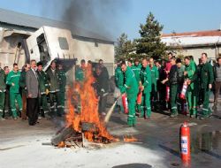 Bu kapsamda, belediyenin boyahane, tamirhane, atölye ve kaynak atölyesi gibi birimlerinde, benzin, parlayıcı ve patlayıcı maddelerle çalışan işçilere yangın söndürme teknikleri konusunda eğitim verildi.